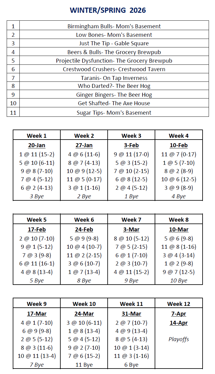 The Birmingham Dart League is based in Birmingham, AL. We are a player-centered organization with teams having home bars as well as traveling to other establishments around the city. Sign up now. League has been active since January 2011.