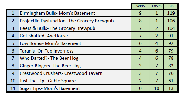 The Birmingham Dart League is based in Birmingham, AL. We are a player-centered organization with teams having home bars as well as traveling to other establishments around the city. Sign up now. League has been active since January 2011.