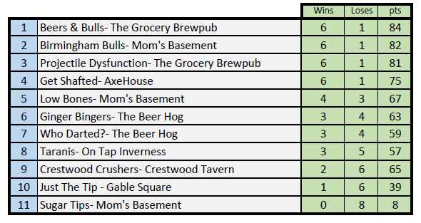 Birmingham Dart League standings for current season